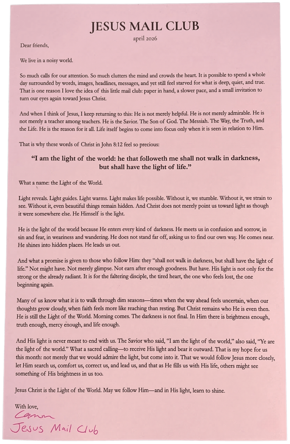 Jesus Mail Club is about Jesus, Jesus, Jesus, and the joy of real mail. It is a gentle invitation to step out of the noise, open something beautiful, and be drawn back to Jesus.